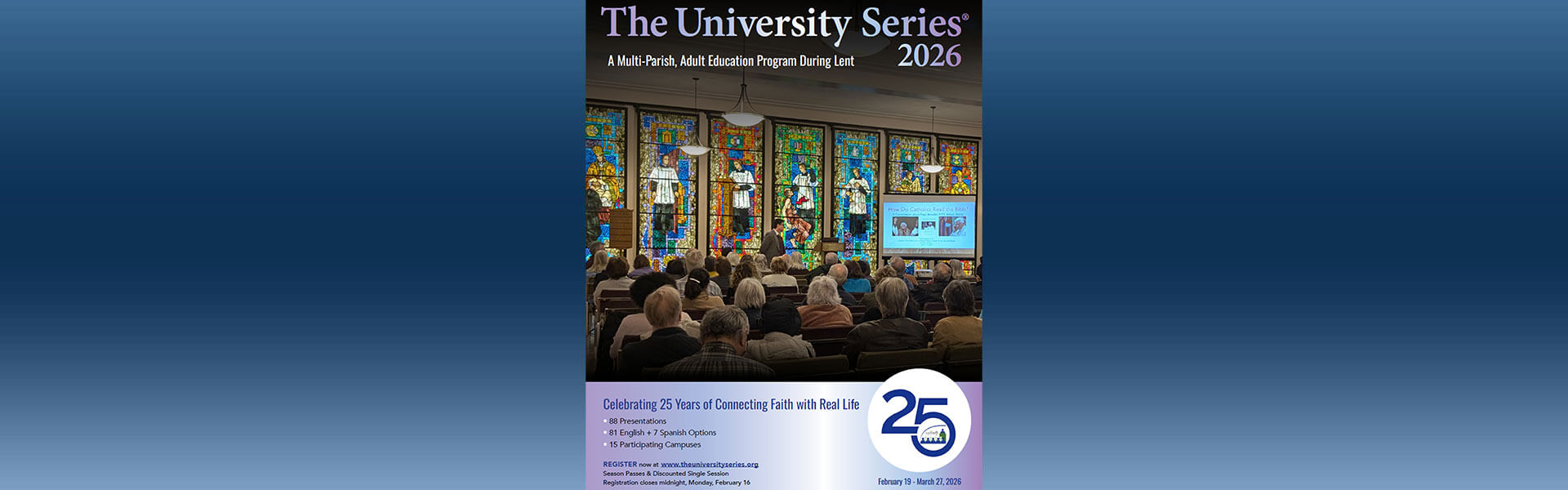 During the season of Lent, The 2026 University Series will be offering in-person sessions – including Q&A with faculty presenters – connecting faith with real life in areas such as Bible Studies, Church History, Current Events, Evangelization, Faith and Science, Liturgy and Sacraments, Marriage and Family, Spirituality, Young Adult topics, and other priorities set by the Los Angeles Archdiocesan Synod. Sessions include multi-media presentations and always allow time for your questions.